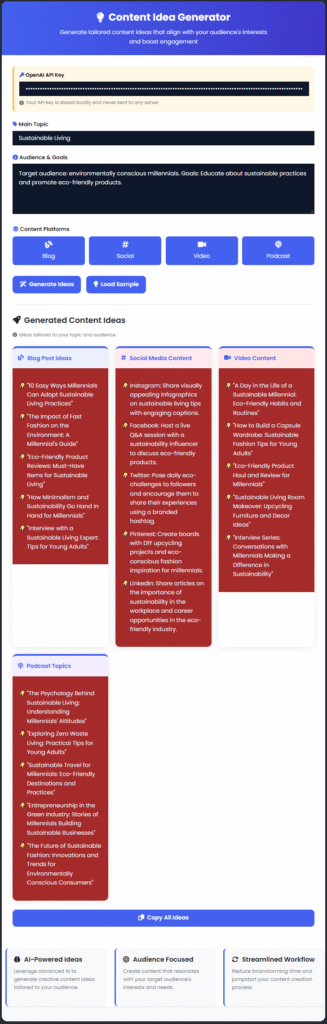 Leverage advanced AI to generate creative content ideas tailored to your audience.
